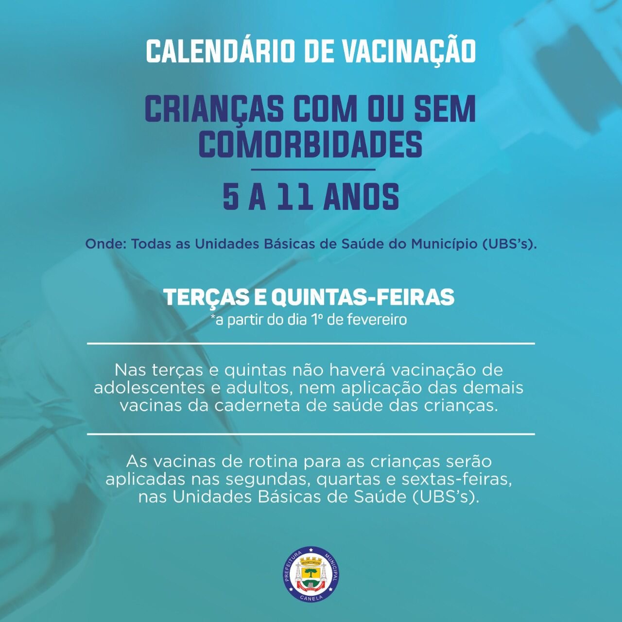 A Prefeitura de Canela, por meio do Departamento de Vigilância Epidemiológica, informa que está implantando um novo calendário de vacinação contra o coronavírus. A mudança separa dias da semana específicos para a imunização das crianças com comorbidades ou deficiência permanente: terças e quintas-feiras.