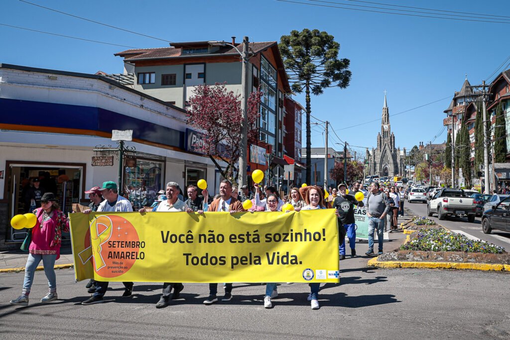 O sol brilhou nesta quarta-feira, dia 10, para a Caminhada pela Vida em Canela. O ato integrou a programação do Setembro Amarelo em Canela – Mês de Prevenção ao Suicídio. A atividade teve início em frente à Catedral de Pedra e seguiu até a Praça João Corrêa, com várias apresentações culturais ao longo da tarde. O evento foi promovido pela Prefeitura, por meio da Secretaria Municipal de Saúde, em alusão ao Dia Mundial de Prevenção do Suicídio.