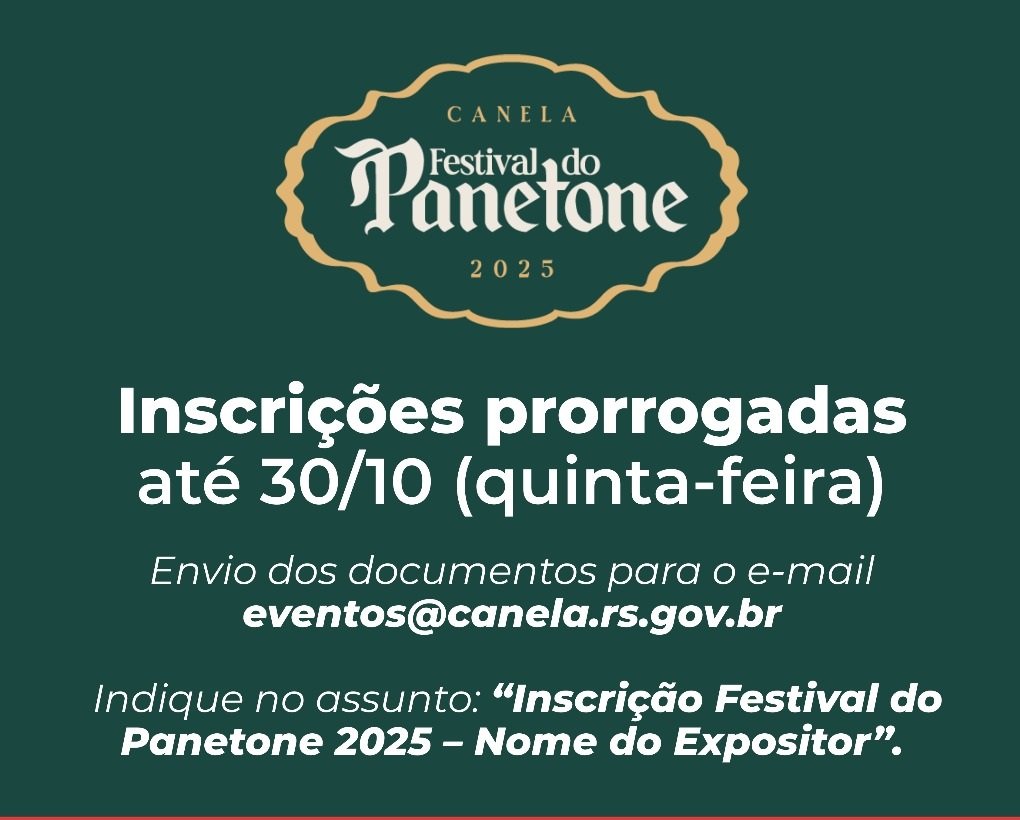 Para se credenciar, o interessado deverá enviar os documentos para o endereço eletrônico eventos@canela.rs.gov.br, até às 23h59 desta quinta-feira, indicando no assunto do e-mail o seguinte: “Inscrição Festival do Panetone 2025 – Nome do Expositor”.