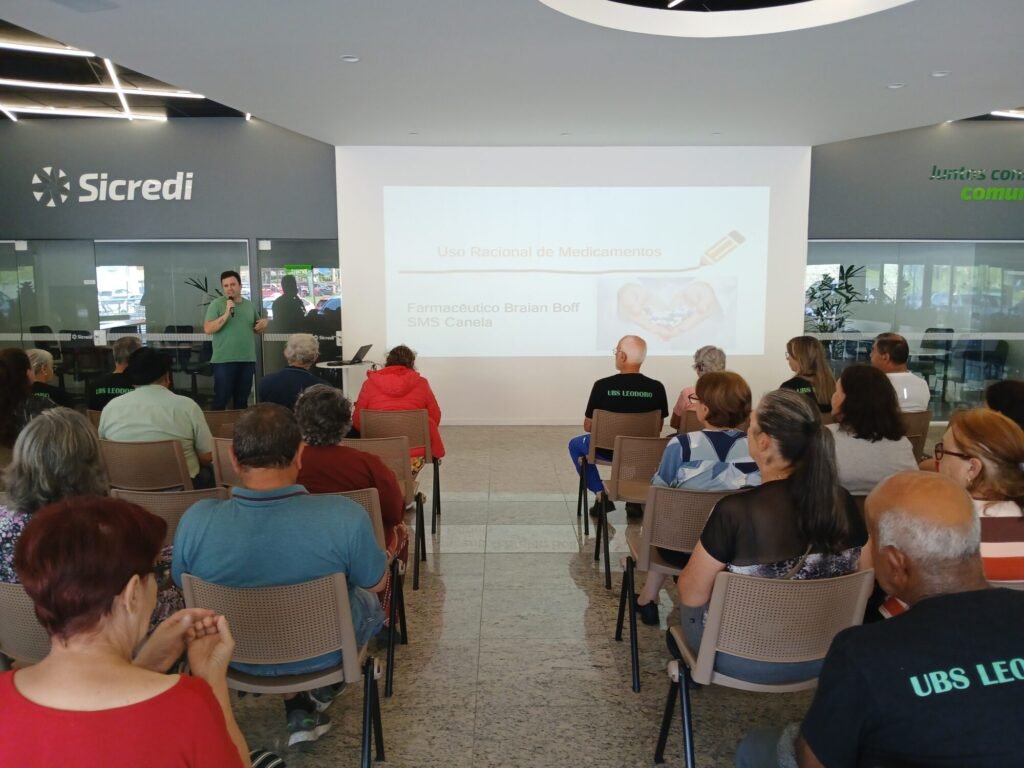 A palestra foi ministrada pelo farmacêutico Braian Boff, da Farmácia Municipal de Canela. Entre os temas abordados estiveram o funcionamento da Farmácia Básica do município — responsável pela distribuição de medicamentos conforme a lista do Ministério da Saúde, mediante prescrição do SUS — e o Programa Farmácia Popular, que amplia o acesso da população a medicamentos essenciais por meio de farmácias credenciadas, mediante apresentação de documento e receita válida.